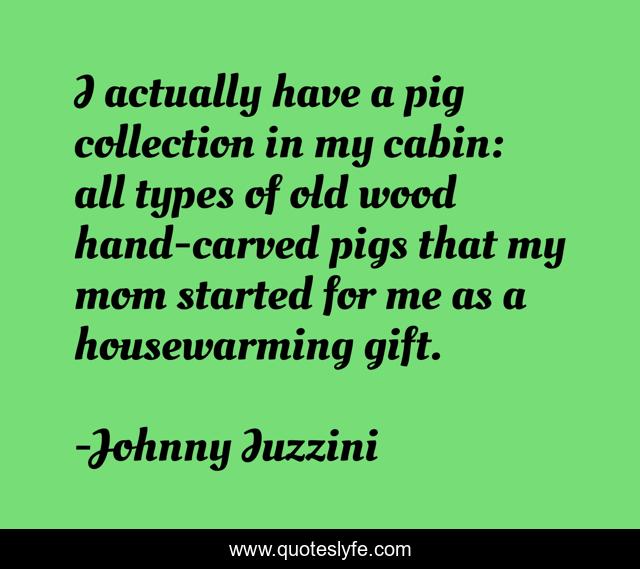 This page presents the quote "I actually have a pig collection in my cabin: all types of old wood hand-carved pigs that my mom started for me as a housewarming gift.". Author of this quote is Johnny Iuzzini. This quote is about me, wood, gift,.