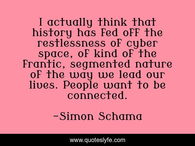 This page presents the quote "I actually think that history has fed off the restlessness of cyber space, of kind of the frantic, segmented nature of the way we lead our lives. People want to be connected.". Author of this quote is Simon Schama. This quote is about people, nature, history,.