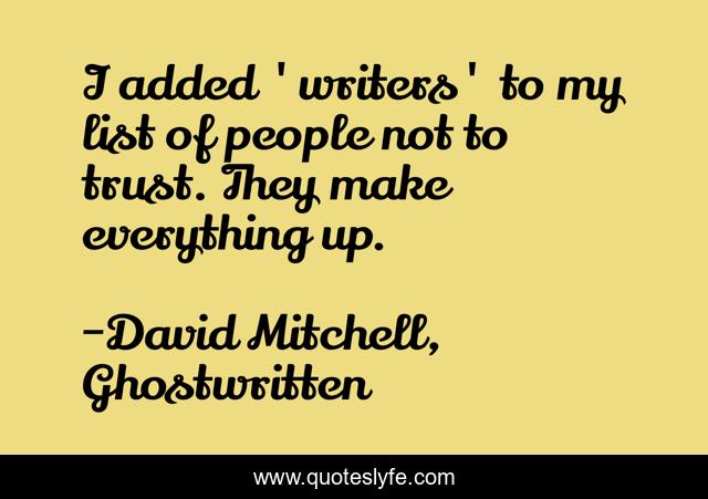 This page presents the quote "I added 'writers' to my list of people not to trust. They make everything up.". Author of this quote is David Mitchell, Ghostwritten. .