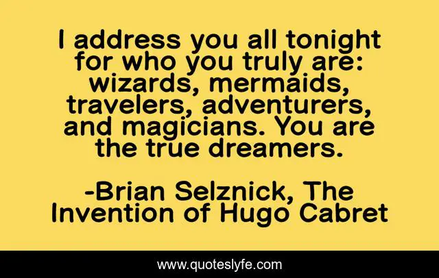 This page presents the quote "I address you all tonight for who you truly are: wizards, mermaids, travelers, adventurers, and magicians. You are the true dreamers.". Author of this quote is Brian Selznick, The Invention of Hugo Cabret. This quote is about mermaids, dreamers, travel, wizard, magic,.