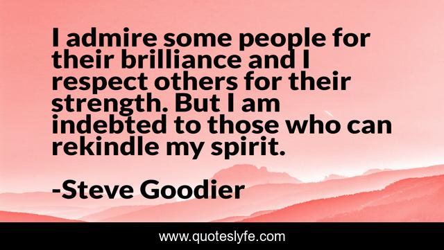 This page presents the quote "I admire some people for their brilliance and I respect others for their strength. But I am indebted to those who can rekindle my spirit.". Author of this quote is Steve Goodier. This quote is about encouragement, hopelessness, friendship, spirit, hope, inspiration,.