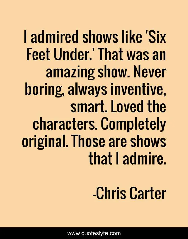 This page presents the quote "I admired shows like 'Six Feet Under.' That was an amazing show. Never boring, always inventive, smart. Loved the characters. Completely original. Those are shows that I admire.". Author of this quote is Chris Carter. This quote is about feet, loved, smart,.