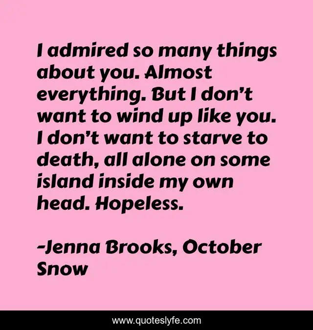 This page presents the quote "I admired so many things about you. Almost everything. But I don’t want to wind up like you. I don’t want to starve to death, all alone on some island inside my own head. Hopeless.". Author of this quote is Jenna Brooks, October Snow. This quote is about relationships, strong-women, domestic-violence, revenge, strong-female-characters,.