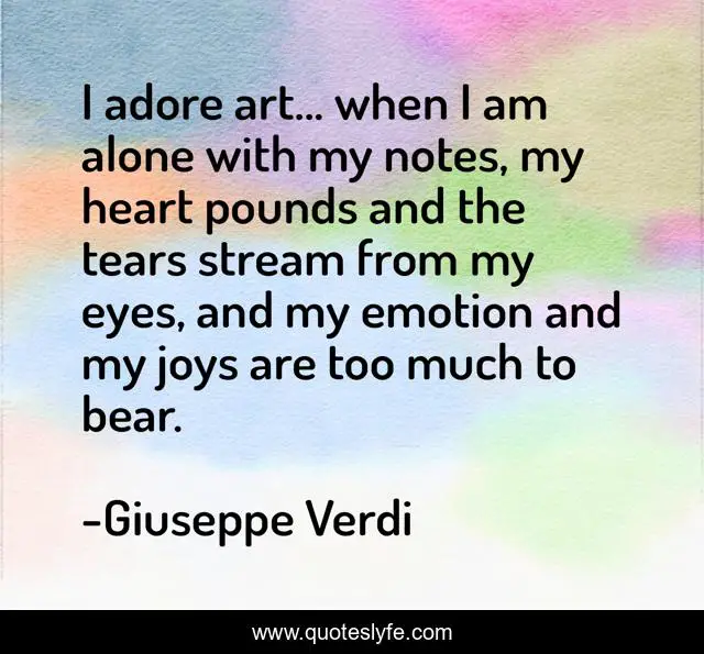 This page presents the quote "I adore art... when I am alone with my notes, my heart pounds and the tears stream from my eyes, and my emotion and my joys are too much to bear.". Author of this quote is Giuseppe Verdi. This quote is about eyes, art,.