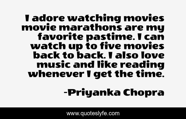 This page presents the quote "I adore watching movies movie marathons are my favorite pastime. I can watch up to five movies back to back. I also love music and like reading whenever I get the time.". Author of this quote is Priyanka Chopra. This quote is about love, music, affection, time,.