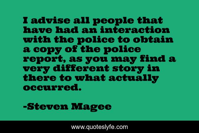 This page presents the quote "I advise all people that have had an interaction with the police to obtain a copy of the police report, as you may find a very different story in there to what actually occurred.". Author of this quote is Steven Magee. This quote is about all, people, obtain, story, law, police, sheriff, actually, version,.