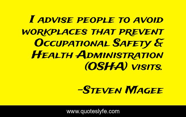 This page presents the quote "I advise people to avoid workplaces that prevent Occupational Safety & Health Administration (OSHA) visits.". Author of this quote is Steven Magee. This quote is about prevent, people, avoid, administration, workplaces, visits, osha, health, safety,.