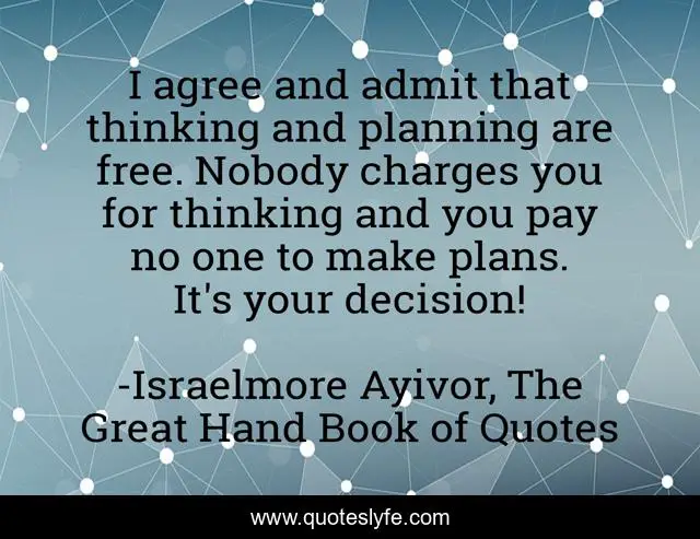 This page presents the quote "I agree and admit that thinking and planning are free. Nobody charges you for thinking and you pay no one to make plans. It's your decision!". Author of this quote is Israelmore Ayivor, The Great Hand Book of Quotes. This quote is about decide-to-fly, dream-big, money, planning, thinking-is-free, food-for-thought, planning-is-free, think-and-plan, thinking,.