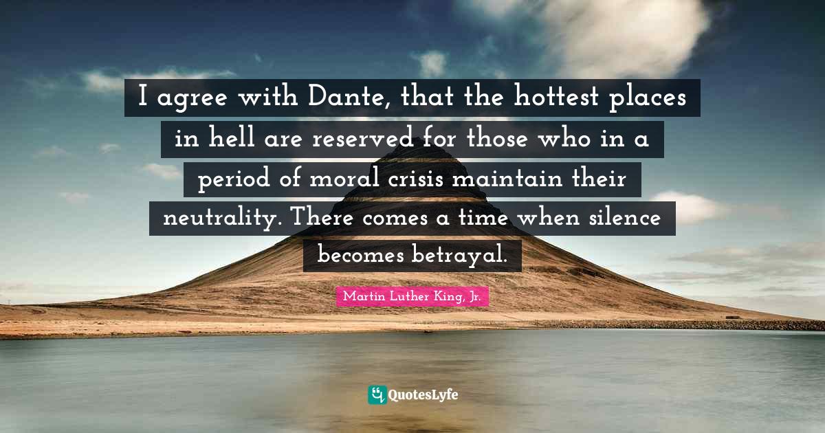 This page presents the quote "I agree with Dante, that the hottest places in hell are reserved for those who in a period of moral crisis maintain their neutrality. There comes a time when silence becomes betrayal.". Author of this quote is Martin Luther King, Jr.. This quote is about hottest, neutrality, moral, reserved, silence, betrayal, crisis, there comes a time, hell,.