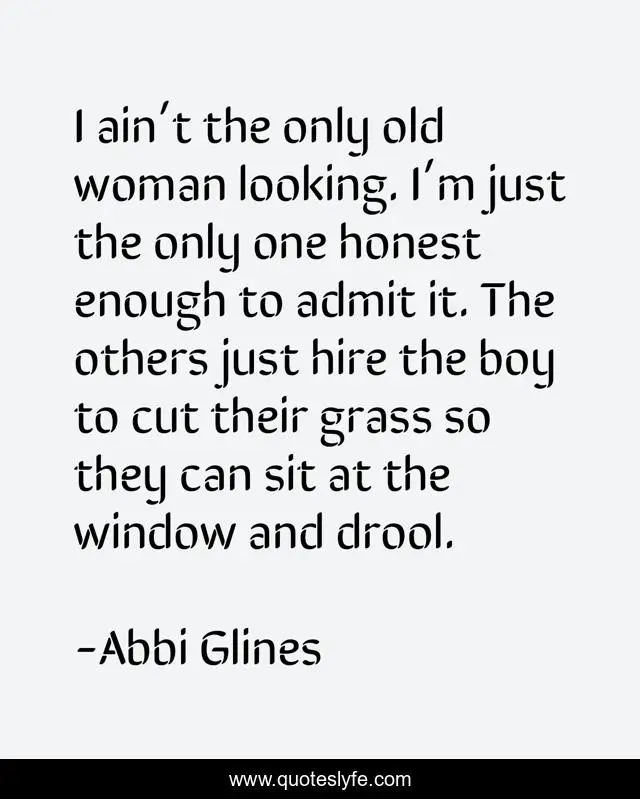 This page presents the quote "I ain’t the only old woman looking. I’m just the only one honest enough to admit it. The others just hire the boy to cut their grass so they can sit at the window and drool.". Author of this quote is Abbi Glines. This quote is about looking, beau, shirtless, woman, the-vincent-boys,.