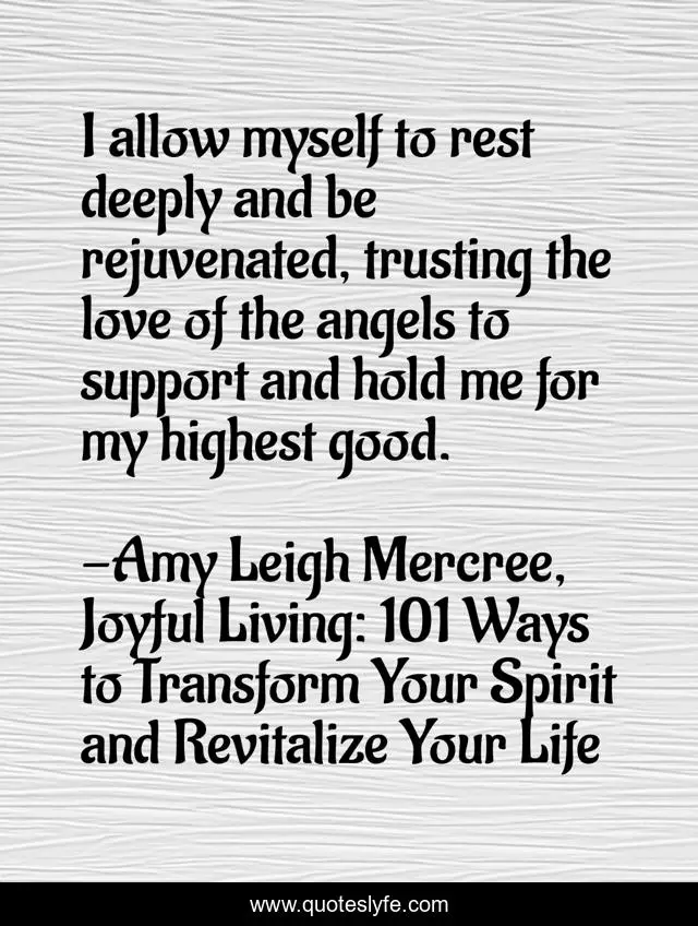 This page presents the quote "I allow myself to rest deeply and be rejuvenated, trusting the love of the angels to support and hold me for my highest good.". Author of this quote is Amy Leigh Mercree, Joyful Living: 101 Ways to Transform Your Spirit and Revitalize Your Life. This quote is about quotes-about-angels, highest-good, quotes-de-la-vida, amy-leigh-mercree, quotes-on-angels, angel, quote-of-the-day, life, joyful-living,.