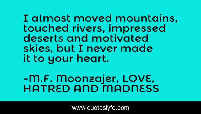 This page presents the quote "I almost moved mountains, touched rivers, impressed deserts and motivated skies, but I never made it to your heart.". Author of this quote is M.F. Moonzajer, LOVE, HATRED AND MADNESS. This quote is about heart, love, deserts, mountains, rivers, skies, affection,.