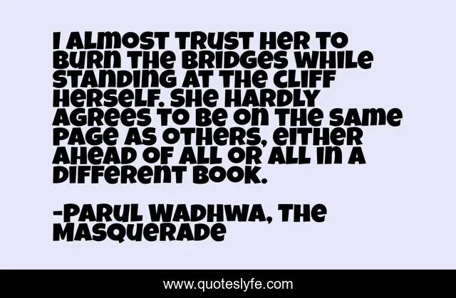 This page presents the quote "I almost trust her to burn the bridges while standing at the cliff herself. She hardly agrees to be on the same page as others, either ahead of all or all in a different book.". Author of this quote is Parul Wadhwa, The Masquerade. This quote is about woman, attitude-toward-lifeude, girl-power, ambitiontion, passionate-livingte, different-perspective, crazy-living, the-masquerade, quotes-about-life,.
