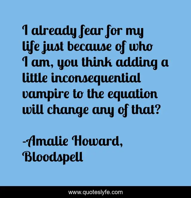 This page presents the quote "I already fear for my life just because of who I am, you think adding a little inconsequential vampire to the equation will change any of that?". Author of this quote is Amalie Howard, Bloodspell. This quote is about bloodspell-book, urban-fantasy, victoria, books-for-teens, bloodspell, young-adult,.