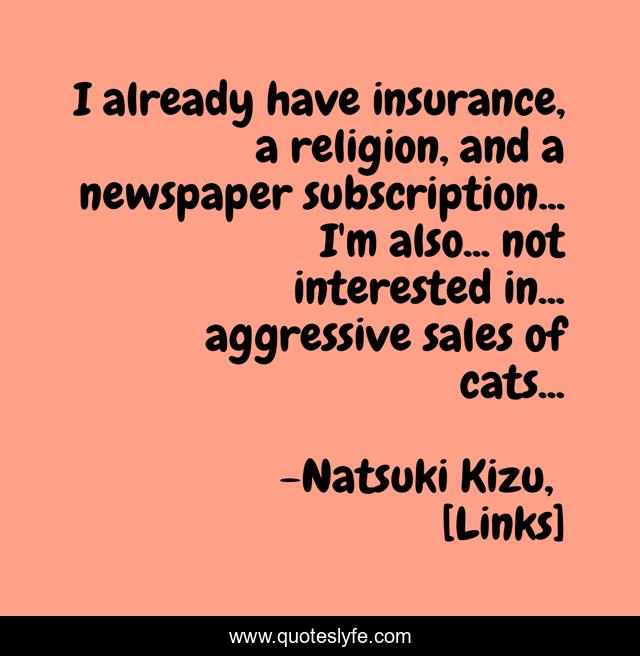 This page presents the quote "I already have insurance, a religion, and a newspaper subscription... I'm also... not interested in... aggressive sales of cats...". Author of this quote is Natsuki Kizu, リンクス [Links]. This quote is about cat, cats, natsuki-kizu, manga,.