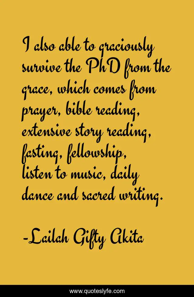 This page presents the quote "I also able to graciously survive the PhD from the grace, which comes from prayer, bible reading, extensive story reading, fasting, fellowship, listen to music, daily dance and sacred writing.". Author of this quote is Lailah Gifty Akita. This quote is about lailah-gifty-akita-affirmations, music, self-education, education, phd, graduate-school, determination, writing, reading,.