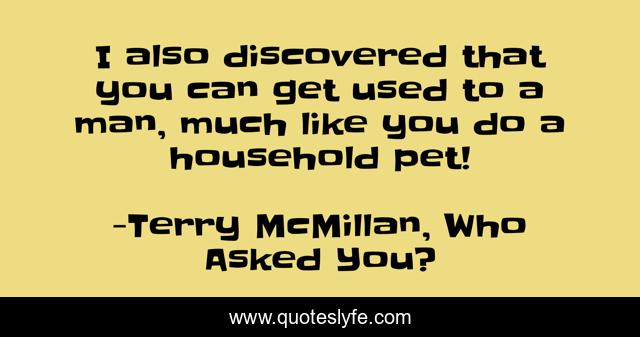 This page presents the quote "I also discovered that you can get used to a man, much like you do a household pet!". Author of this quote is Terry McMillan, Who Asked You?. This quote is about relationships, men, relationship-advice, pets, relationship,.