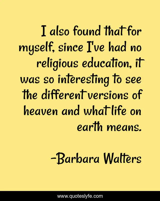This page presents the quote "I also found that for myself, since I've had no religious education, it was so interesting to see the different versions of heaven and what life on earth means.". Author of this quote is Barbara Walters. This quote is about earth, life, myself,.