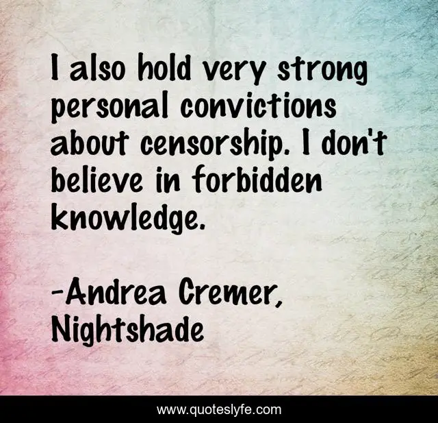 This page presents the quote "I also hold very strong personal convictions about censorship. I don't believe in forbidden knowledge.". Author of this quote is Andrea Cremer, Nightshade. This quote is about forbidden, knowledge, censorship, nightshade,.