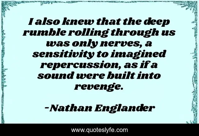 This page presents the quote "I also knew that the deep rumble rolling through us was only nerves, a sensitivity to imagined repercussion, as if a sound were built into revenge.". Author of this quote is Nathan Englander. This quote is about bullying, nerves, revenge,.