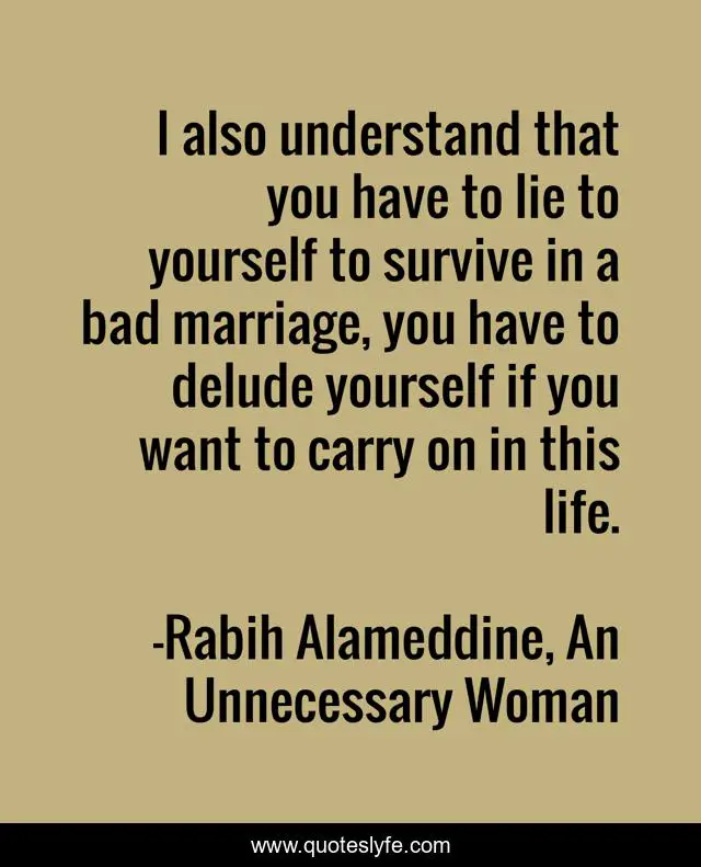 This page presents the quote "I also understand that you have to lie to yourself to survive in a bad marriage, you have to delude yourself if you want to carry on in this life.". Author of this quote is Rabih Alameddine, An Unnecessary Woman. This quote is about life, delusion, lying,.