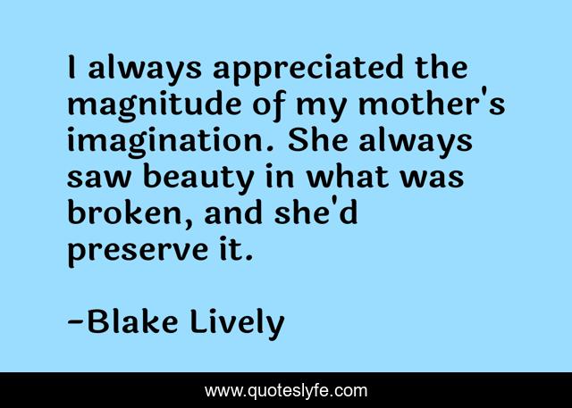 This page presents the quote "I always appreciated the magnitude of my mother's imagination. She always saw beauty in what was broken, and she'd preserve it.". Author of this quote is Blake Lively. This quote is about broken, beauty, mother,.