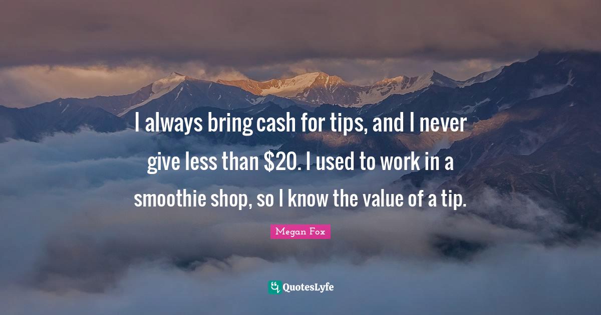 This page presents the quote "I always bring cash for tips, and I never give less than $20. I used to work in a smoothie shop, so I know the value of a tip.". Author of this quote is Megan Fox. This quote is about smoothies, used, giving, cash, work,.