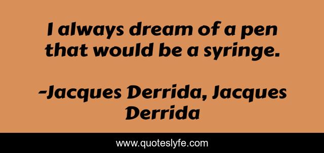 This page presents the quote "I always dream of a pen that would be a syringe.". Author of this quote is Jacques Derrida, Jacques Derrida. This quote is about deconstruction, communication, understanding, influence, writing,.