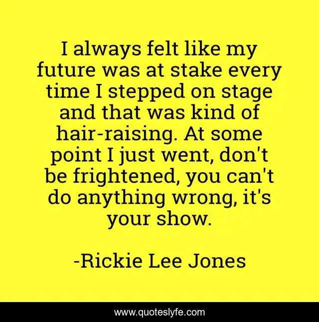 This page presents the quote "I always felt like my future was at stake every time I stepped on stage and that was kind of hair-raising. At some point I just went, don't be frightened, you can't do anything wrong, it's your show.". Author of this quote is Rickie Lee Jones. This quote is about kind, time,.