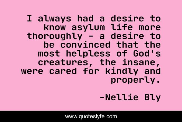 This page presents the quote "I always had a desire to know asylum life more thoroughly - a desire to be convinced that the most helpless of God's creatures, the insane, were cared for kindly and properly.". Author of this quote is Nellie Bly. This quote is about desire, life,.
