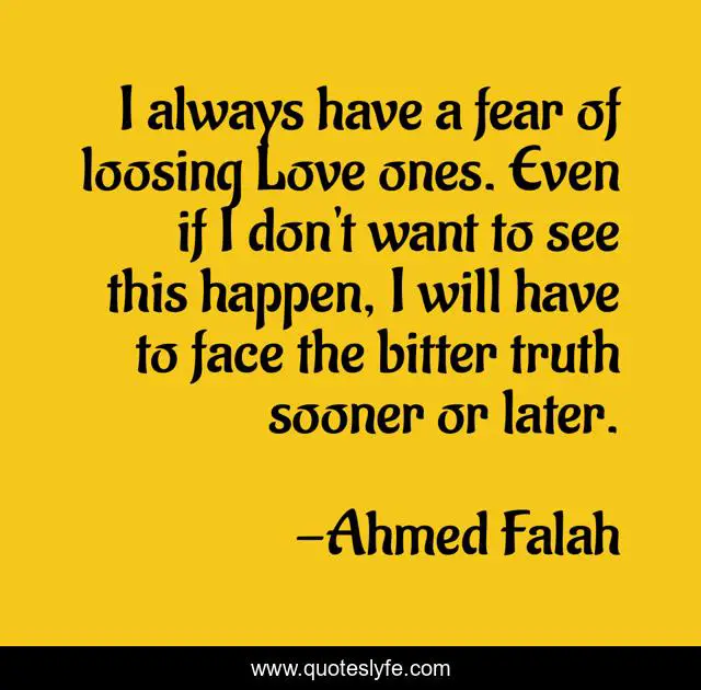 This page presents the quote "I always have a fear of loosing Love ones. Even if I don't want to see this happen, I will have to face the bitter truth sooner or later.". Author of this quote is Ahmed Falah. This quote is about loose, love, death-and-dying, affection, loosening,.