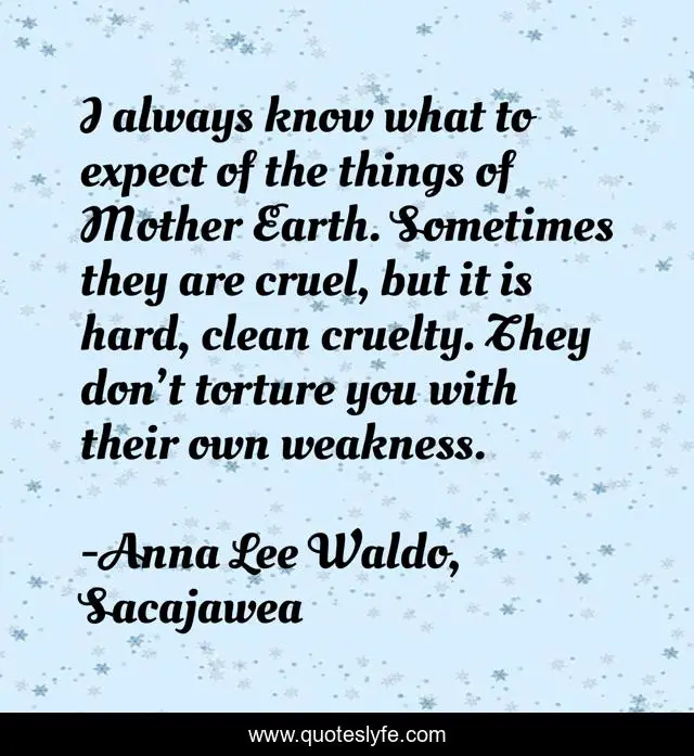 This page presents the quote "I always know what to expect of the things of Mother Earth. Sometimes they are cruel, but it is hard, clean cruelty. They don’t torture you with their own weakness.". Author of this quote is Anna Lee Waldo, Sacajawea. This quote is about weakness, humanity, nature,.