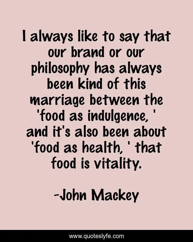This page presents the quote "I always like to say that our brand or our philosophy has always been kind of this marriage between the 'food as indulgence, ' and it's also been about 'food as health, ' that food is vitality.". Author of this quote is John Mackey. This quote is about food, philosophy, marriage,.
