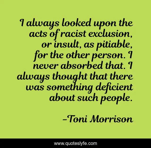 This page presents the quote "I always looked upon the acts of racist exclusion, or insult, as pitiable, for the other person. I never absorbed that. I always thought that there was something deficient about such people.". Author of this quote is Toni Morrison. This quote is about racism, power,.