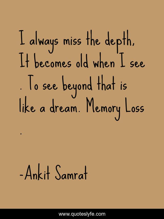 This page presents the quote "I always miss the depth, It becomes old when I see . To see beyond that is like a dream. Memory Loss .". Author of this quote is Ankit Samrat. This quote is about life, experience,.