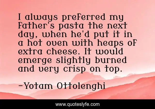 This page presents the quote "I always preferred my father's pasta the next day, when he'd put it in a hot oven with heaps of extra cheese. It would emerge slightly burned and very crisp on top.". Author of this quote is Yotam Ottolenghi. This quote is about cheese, father, day,.