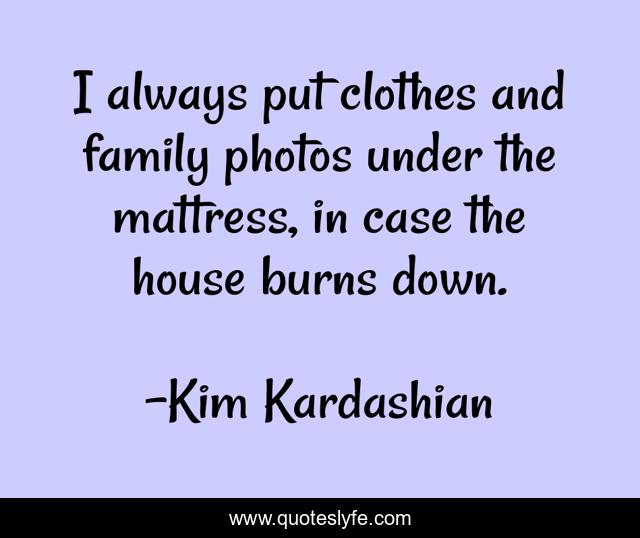 This page presents the quote "I always put clothes and family photos under the mattress, in case the house burns down.". Author of this quote is Kim Kardashian. This quote is about down, house, clothes,.