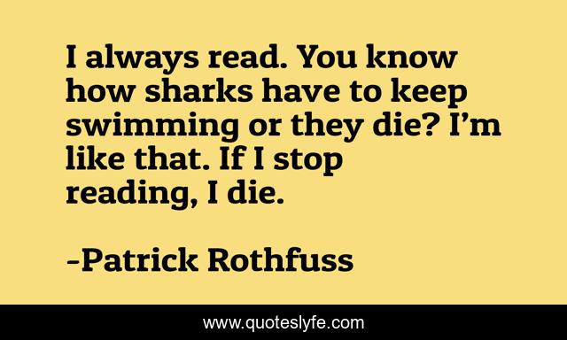 This page presents the quote "I always read. You know how sharks have to keep swimming or they die? I’m like that. If I stop reading, I die.". Author of this quote is Patrick Rothfuss. .