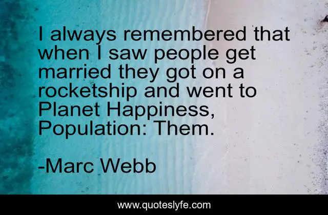 This page presents the quote "I always remembered that when I saw people get married they got on a rocketship and went to Planet Happiness, Population: Them.". Author of this quote is Marc Webb. This quote is about always, happiness, people,.