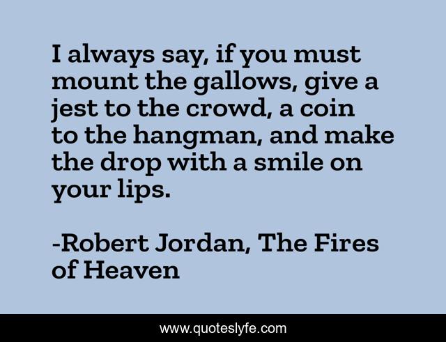 This page presents the quote "I always say, if you must mount the gallows, give a jest to the crowd, a coin to the hangman, and make the drop with a smile on your lips.". Author of this quote is Robert Jordan, The Fires of Heaven. This quote is about smile, courage, death, happiness,.