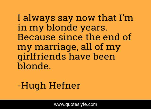 This page presents the quote "I always say now that I'm in my blonde years. Because since the end of my marriage, all of my girlfriends have been blonde.". Author of this quote is Hugh Hefner. This quote is about blonde, dating, end,.