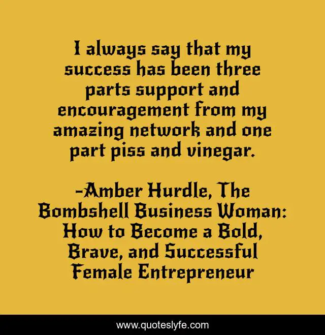 This page presents the quote "I always say that my success has been three parts support and encouragement from my amazing network and one part piss and vinegar.". Author of this quote is Amber Hurdle, The Bombshell Business Woman: How to Become a Bold, Brave, and Successful Female Entrepreneur. This quote is about inspiration, encouragement, success, tenacity,.