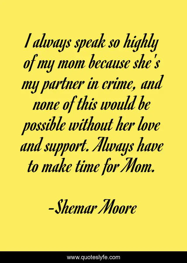 This page presents the quote "I always speak so highly of my mom because she's my partner in crime, and none of this would be possible without her love and support. Always have to make time for Mom.". Author of this quote is Shemar Moore. This quote is about support, love, affection, time,.