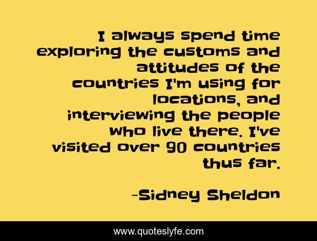 This page presents the quote "I always spend time exploring the customs and attitudes of the countries I'm using for locations, and interviewing the people who live there. I've visited over 90 countries thus far.". Author of this quote is Sidney Sheldon. This quote is about live, time, people,.