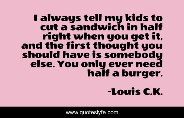This page presents the quote "I always tell my kids to cut a sandwich in half right when you get it, and the first thought you should have is somebody else. You only ever need half a burger.". Author of this quote is Louis C.K.. This quote is about food, selflessness, sandwich,.