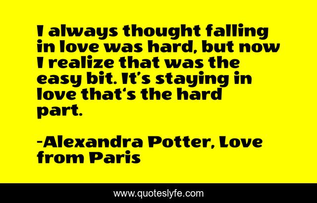 This page presents the quote "I always thought falling in love was hard, but now I realize that was the easy bit. It’s staying in love that‘s the hard part.". Author of this quote is Alexandra Potter, Love from Paris. This quote is about paris, love, adventure, affection,.