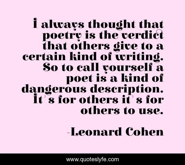 This page presents the quote "I always thought that poetry is the verdict that others give to a certain kind of writing. So to call yourself a poet is a kind of dangerous description. It's for others it's for others to use.". Author of this quote is Leonard Cohen. This quote is about thought, writing, yourself,.