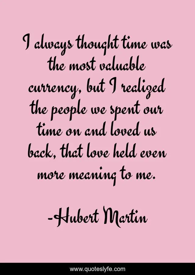 This page presents the quote "I always thought time was the most valuable currency, but I realized the people we spent our time on and loved us back, that love held even more meaning to me.". Author of this quote is Hubert Martin. This quote is about love, honesty, intelligence, deep, sleep, best, poem, confidence, humor,.