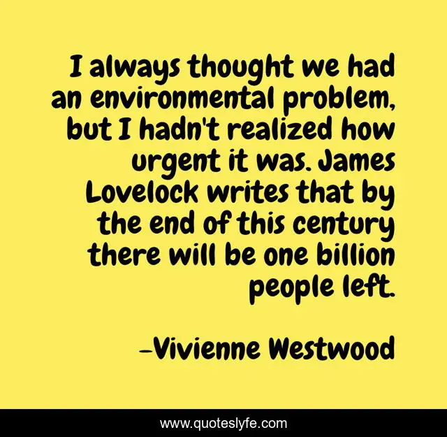 This page presents the quote "I always thought we had an environmental problem, but I hadn't realized how urgent it was. James Lovelock writes that by the end of this century there will be one billion people left.". Author of this quote is Vivienne Westwood. This quote is about problem, end, people,.