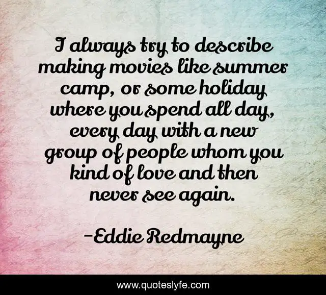 This page presents the quote "I always try to describe making movies like summer camp, or some holiday where you spend all day, every day with a new group of people whom you kind of love and then never see again.". Author of this quote is Eddie Redmayne. This quote is about love, day, affection, people,.